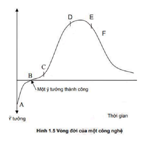 Giai đoạn ấp ủ bắt đầu từ điểm A với số lượng lớn các ý tưởng và kết thúc tại điểm B khi có một ý tưởng thành công, tương ứng với điểm ngay sau giai đoạn kỹ nghệ hóa trên hình 1.4. Kế tiếp, bắt đầu thời kỳ truyền bá công nghệ đến những người áp dụng tiềm tàng tức là những người có nhu cầu và khả năng áp dụng công nghệ nhưng chưa áp dụng. Trong khoảng thời gian từ B đến C, giai đoạn giới thiệu, số lượng người áp dụng tăng rất chậm, đoạn BC rất thoải vì lúc đầu thông tin về công nghệ mới chưa kịp phổ biến và độ rủi ro còn cao. Ở giai đoạn tăng trưởng CD, số lượng người áp dụng tăng rất nhanh vì hai nguyên nhân ngăn cản quá trình tăng trưởng ở giai đoạn trước không còn nữa. Quy luật gia tăng số lượng người áp dụng ở giai đoạn này bị chi phối bởi số lượng người áp dụng tiềm tàng. Ở nửa giai đoạn đầu, công nghệ tăng trưởng với gia tốc càng ngày càng cao vì số lượng người áp dụng tiềm tàng còn lớn, còn ở nửa giai đoạn cuối gia tốc tăng trưởng đổi dấu và càng ngày càng giảm vì số lượng người áp dụng tiềm tàng càng ngày càng nhỏ. Đoạn DE là giai đoạn trưởng thành, số lượng người áp dụng tiếp tục tăng và sau đấy bắt đầu giảm đều rất chậm. Lúc ngày công nghệ đã lạc hậu nên bị thay thế bởi một hoặc nhiều công nghệ khác. Vòng đời của một công nghệ được kết thúc bằng giai đoạn suy tàn với số lượng người áp dụng giảm với tốc độ càng ngày càng lớn, lúc này công nghệ lạc hậu với tốc độ lạc hậu càng ngày càng cao. Thời lượng của các giai đoạn và tổng thời lượng của vòng đời phụ thuộc vào rất nhiều yếu tố như mức đầu tư vào công nghệ, tốc độ nghiên cứu và triển khai, tiến bộ công nghệ…