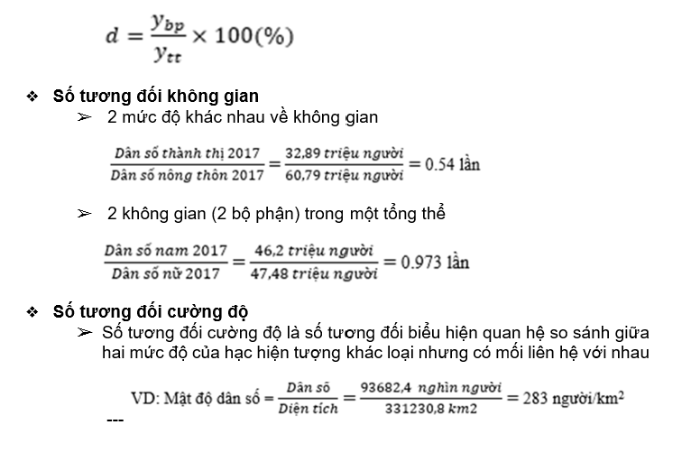 o Chỉ tiêu tương đối. VD: Mật độ dân số của Việt Nam năm 2010 là 263 người/ km2