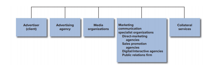 - DN quảng cáo (Advertising agency): là tổ chức chuyên nghiệp, cung cấp cho khách hàng các dịch vụ như sáng tạo thông điệp, tư vấn lập kế hoạch, chuẩn bị, đặt chỗ quảng cáo,…