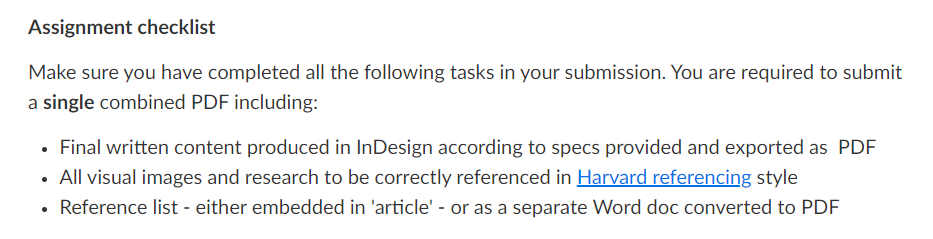 - You must include a reference list along with your magazine spread, either embedded in the text or as a separate word document (converted to a PDF -if the file is not in PDF format, it will be an automatic zero for the assignment) for inclusion with your assignment submission.