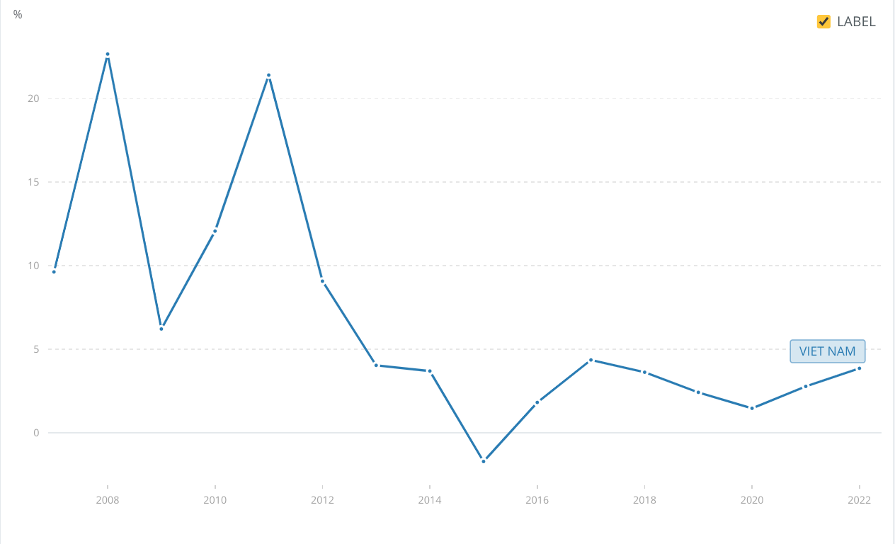 Figure 1: Inflation rate in Vietnam in the period 2007 - 2022 (The World Bank)